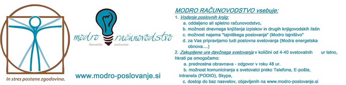 Modro Posloovanje predstavlja nadgradnjo računovodenja, saj vključuje uporabne oz. praktične storitve, ki znižujejo tveganja pri poslovanju podjetja. Modro Poslovanje pomeni: